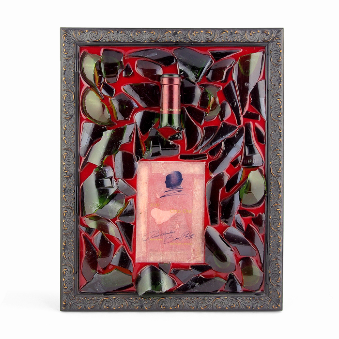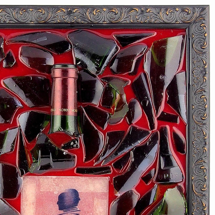 岡山県在住のアーティストにより制作された、アメリカの高級赤ワインの瓶を利用したアートフレーム。
