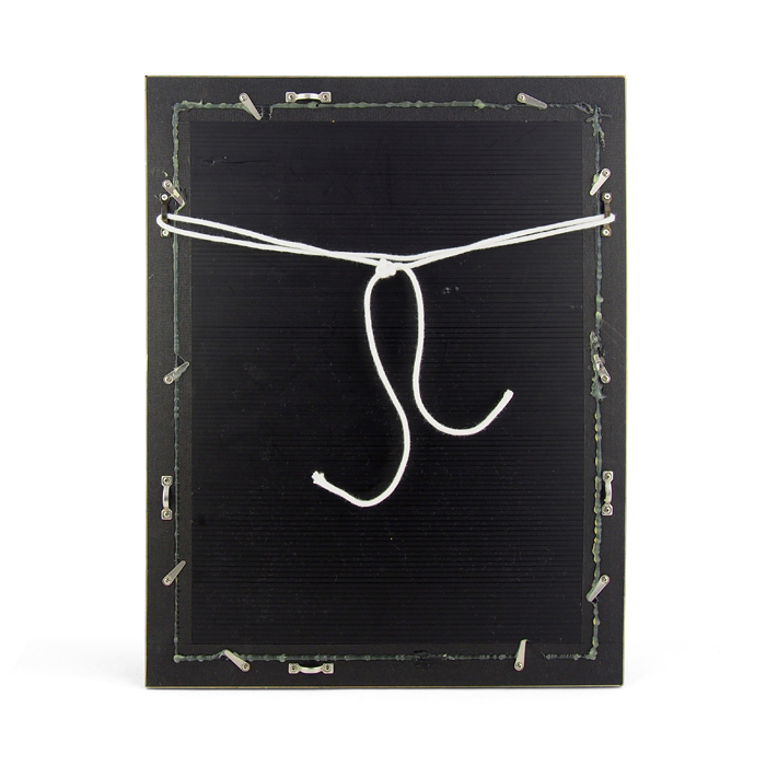 米国の邸宅を思わせる格調高い雰囲気のフレームに、瓶の欠片とラベルをあしらった重厚で存在感のあるアートです。