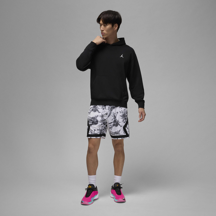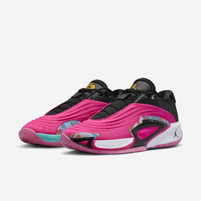 鮮やかなピンクトーンで全体を覆い、アッパーには波打つようなストライプ模様、内側のテキスタイルパネルにはマーブル調のタイダイ柄が施されています。つま先とミッドフット部分にはTPU補強が配置され、最大限のサポート力を発揮。さらに、シューレース、シュータン、履き口、ソックライナーにはブラックが用いられ、ジャンプマンロゴとルカのロゴがデザインを引き締めています。