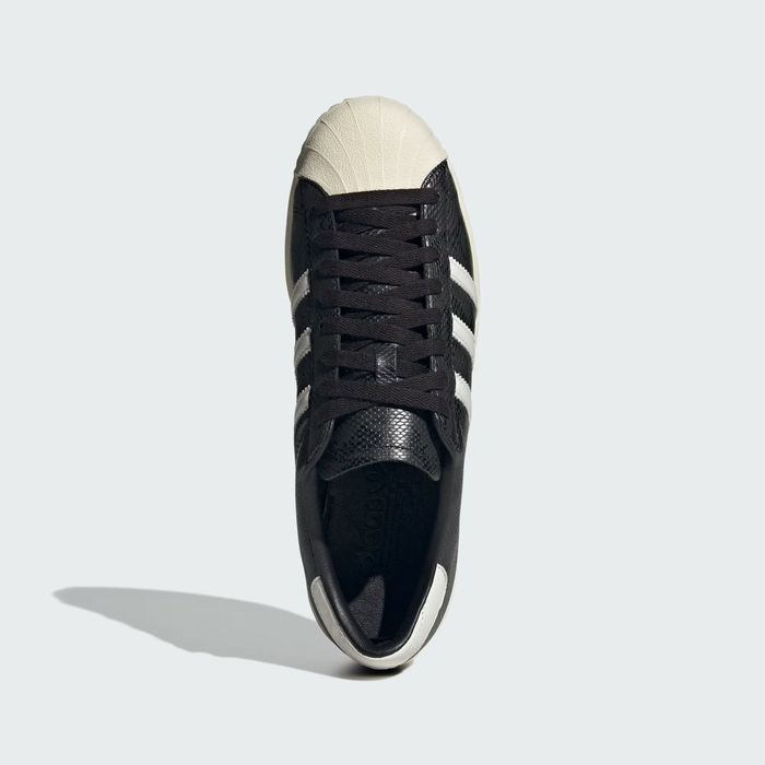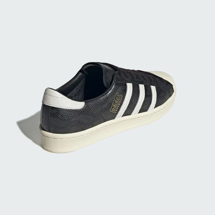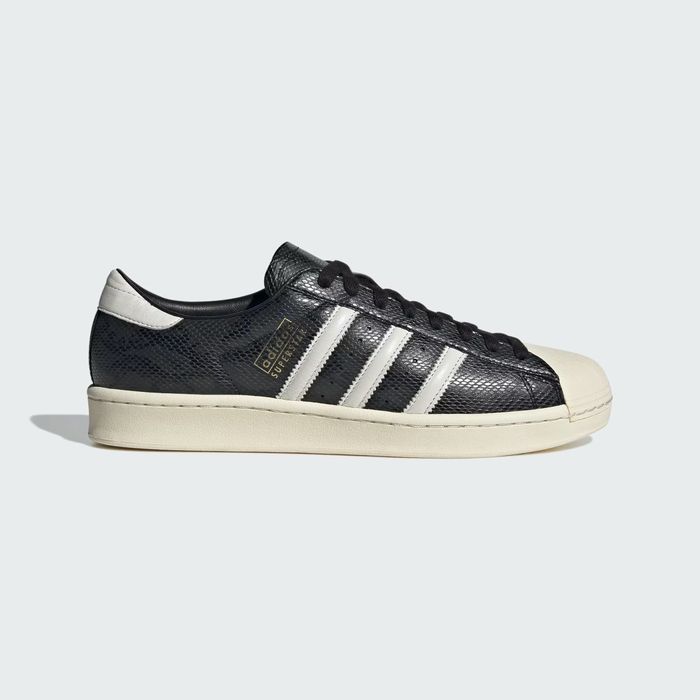 ハンドバッグやスネークスキンシューズのようなリュクスで、上質なレザーにスネークスキンプリントを施したadidasシューズ。このドイツ製のシューズはadidasの伝統を讃えたもので、1970年にバスケットボール用として販売され、その後数十年でadidasの文化的なアイコンとなったシェルトゥが目を引く。メタリックなロゴが本物の証であり、ラバーカップソールがデザインのアクセントに。