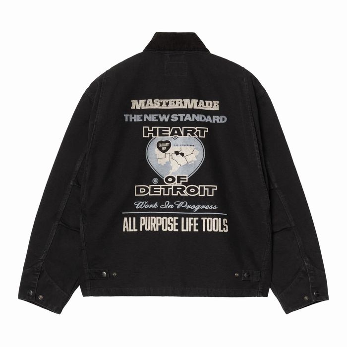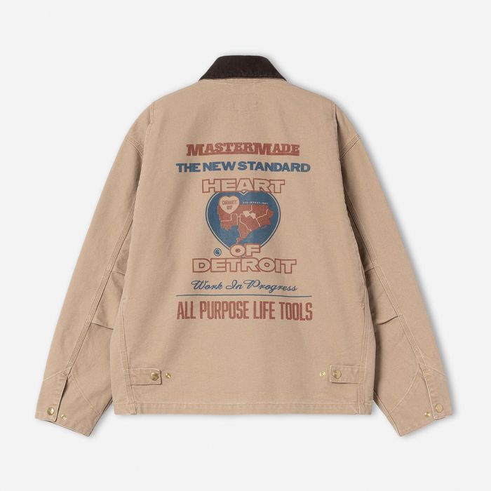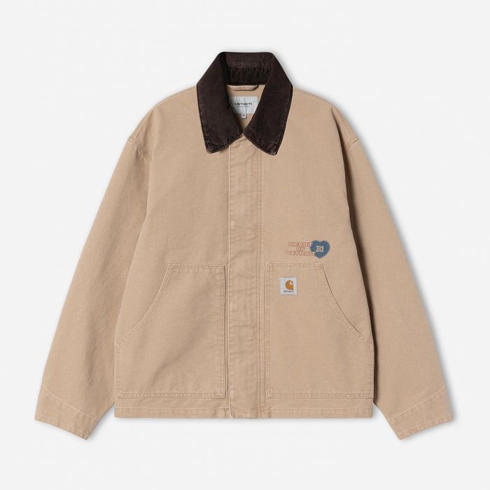 OGアーカングラフィックジャケットは、オリジナルルーズフィットを採用した重厚なコットンディアボーンキャンバス製です。シルエットはルーズフィットで、ややボックス型でオーバーサイズなデザインが特徴です。袖口と後ろの裾にはスナップボタンが施されており、フィット感を調整可能です。また、カンガルーポケットとコーデュロイの襟が特徴的です。前面と背面にはグラフィックプリントが施されており、カーハートWIPのスクエアラベルがデザインを完成させています。