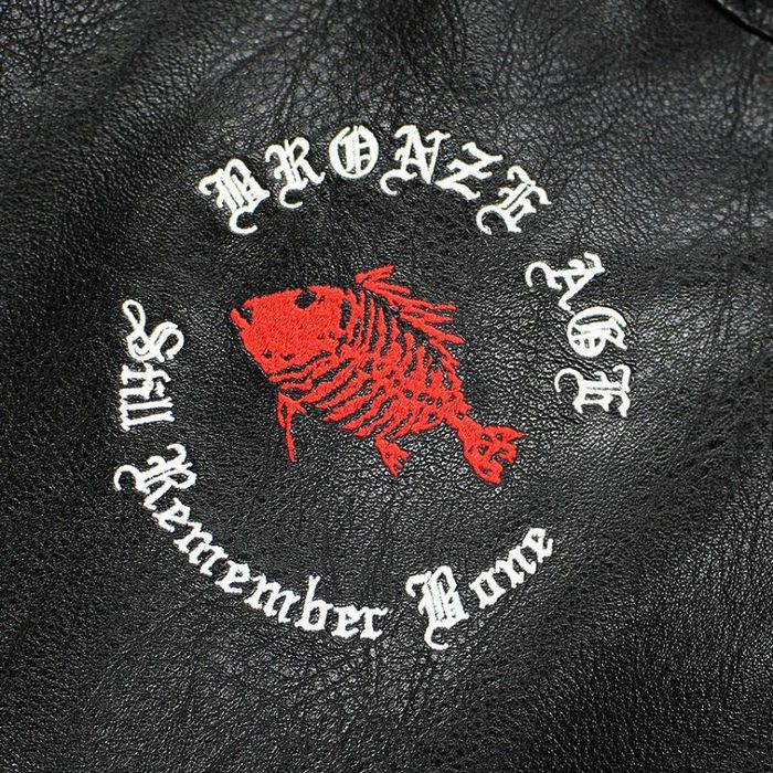 質感の良いPUフェイクレザーで存在感抜群の一枚。サガラワッペンのフロントロゴ、袖刺繍など細部にもこだわり満載。