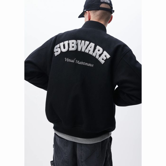 New Yorkを拠点とするアーティストSTASH主宰「SUBWARE」の象徴的なロゴやモチーフを施した、重厚なメルトン素材のスタジアムジャケット。背面のロゴはリフレクター素材。裏地はポリエステルタフタのダイヤキルティング仕様。オリジナルスナップボタン、サイドシームにピスネームを付属。