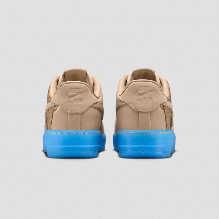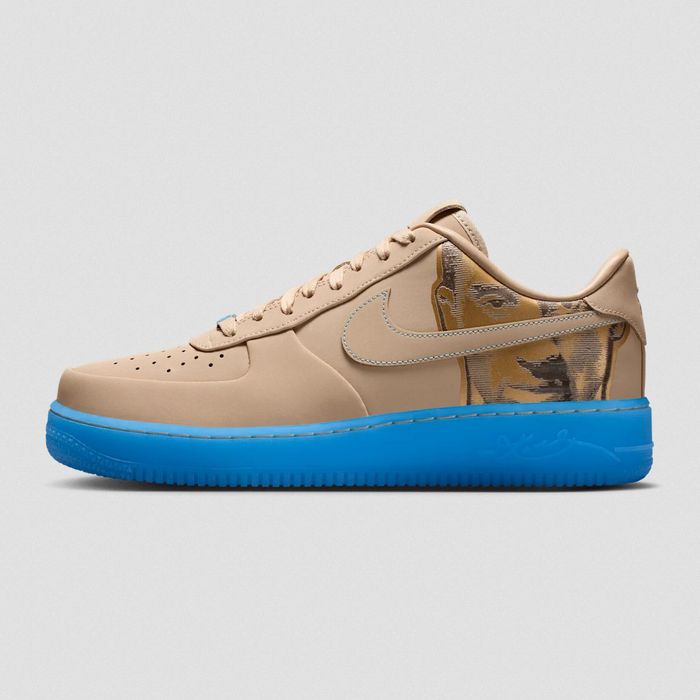 柔らかなリネンの色合いがプレミアムレザーのアッパーを包み込み、コートでのコービーの冷静で緻密なプレーを表現。ユニバーシティブルーのアクセントは、彼のチームのホームタウンであるミネソタのルーツに敬意を示している。さらに、メタリックゴールドのポートレートが、エア フォース 1を情熱を映すキャンバスへと変える。