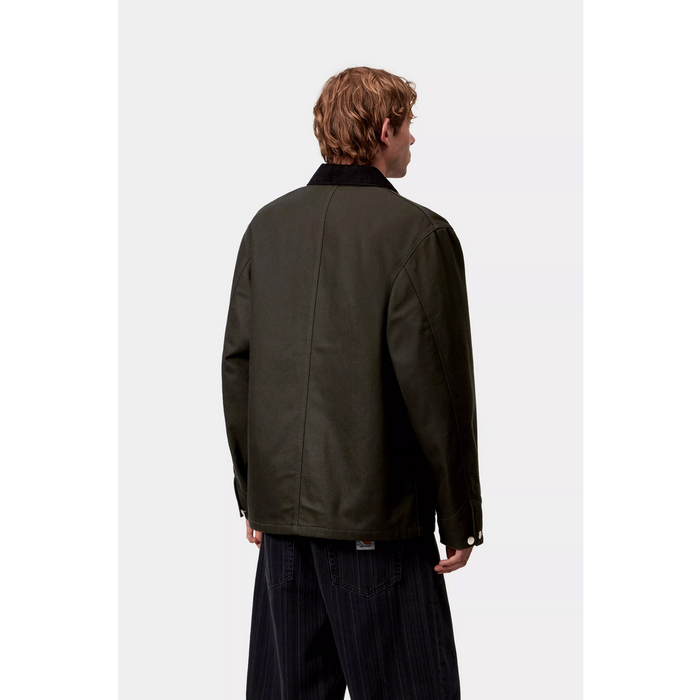 ミシガンコートは、クラシックなチョアコートにインスパイアされており、12オンスの丈夫なディアボーンキャンバス地を使用し、撥水加工を施しています。裏地はブランケットライニング。クラシックなワークウェアのスタイルを取り入れた、コントラストの効いたボタンとリベットのディテールが特徴的です。カーハートWIPのスクエアラベルがデザイン全体を引き立てます。