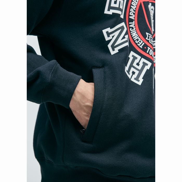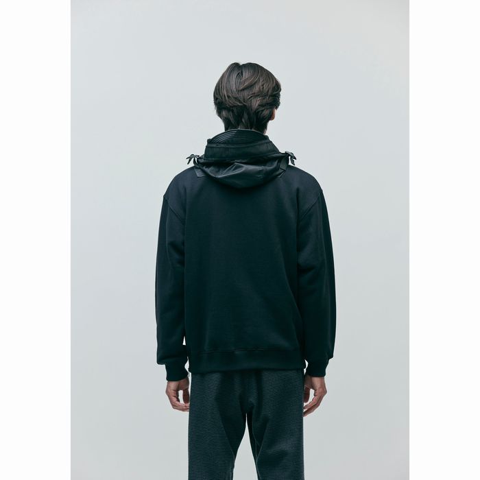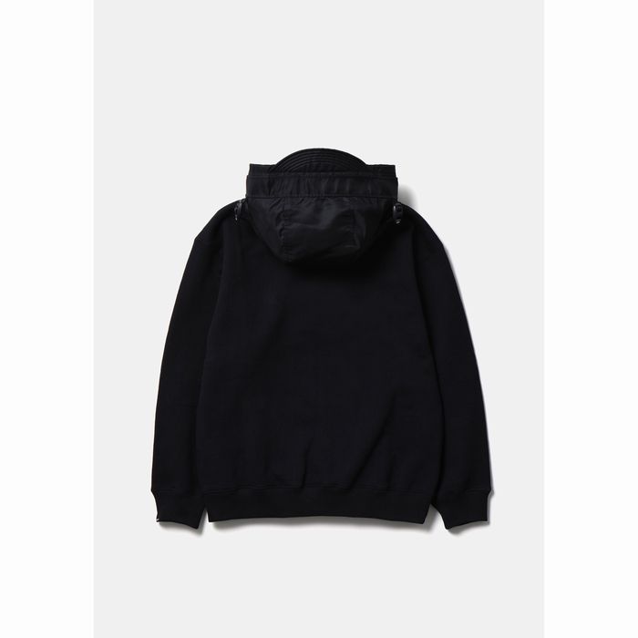 特殊なジャカード機を使用し裏面のループをヘリンボン柄に編み立てた中肉裏毛素材をベースに、ナイロンツイル生地のフードを組み合わせたスウェットフーディ。ファスナ-付きポケットと、スナップボタン付きのサイドシームポケットを配置。 ビスロンファスナーを採用したサイドスリット仕様。フロントにグラフィックをプリント。袖口にピスネームを付属。