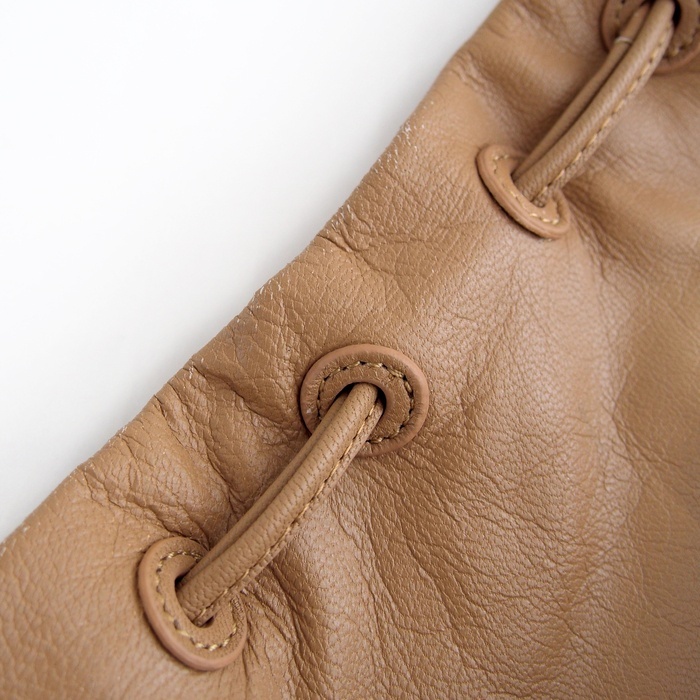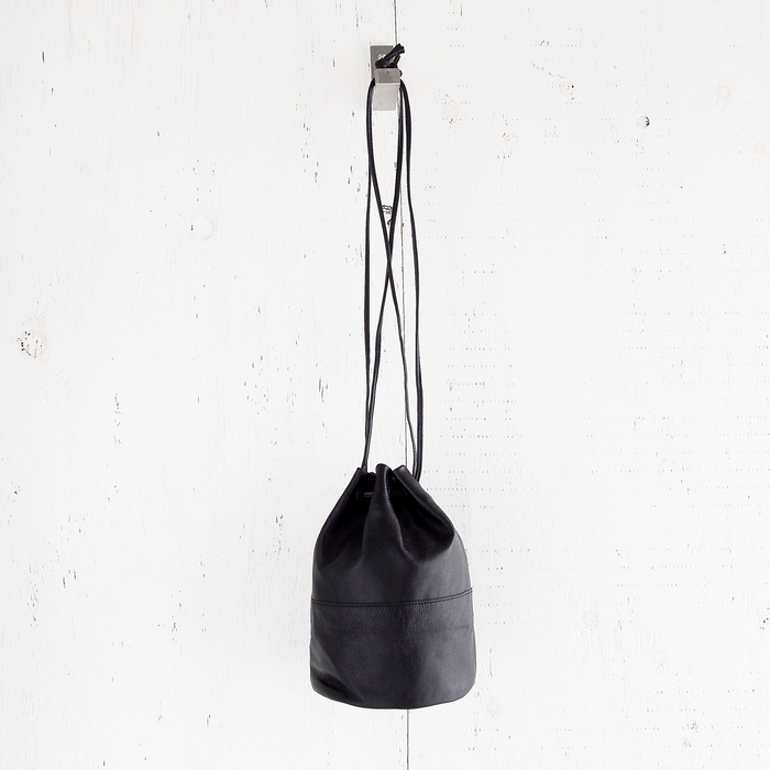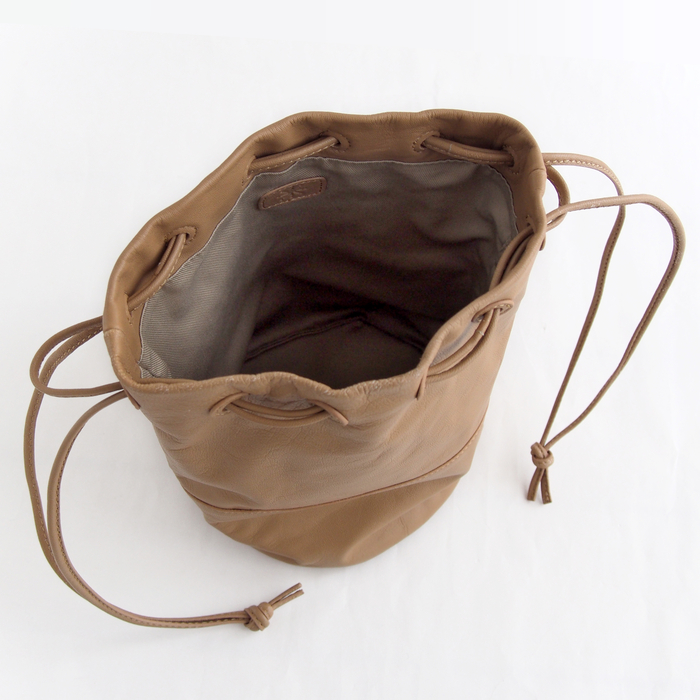 上質な山羊革(ゴートレザー)を使用した、縦型フォルムの巾着ショルダーバッグ。