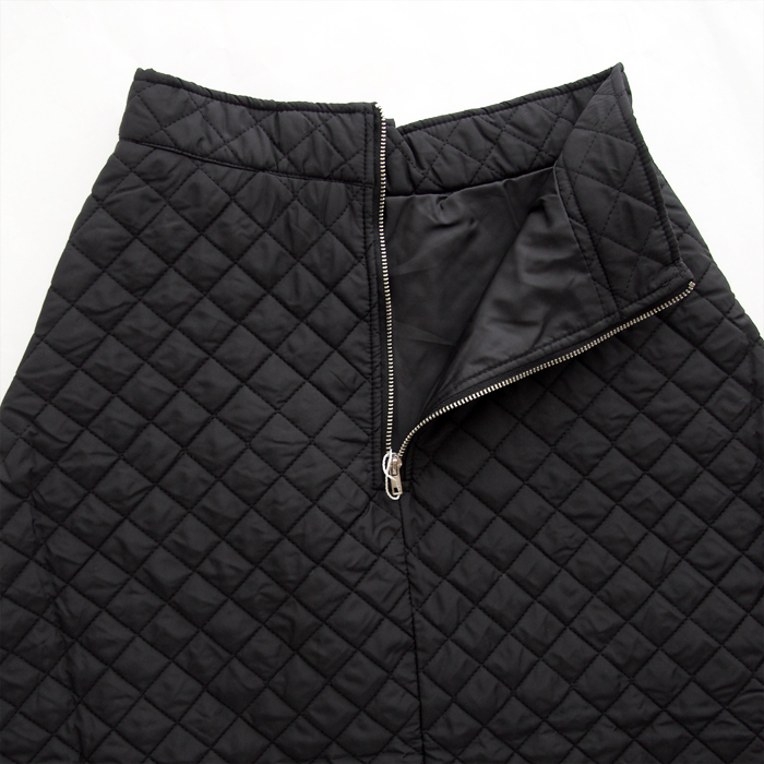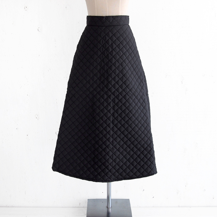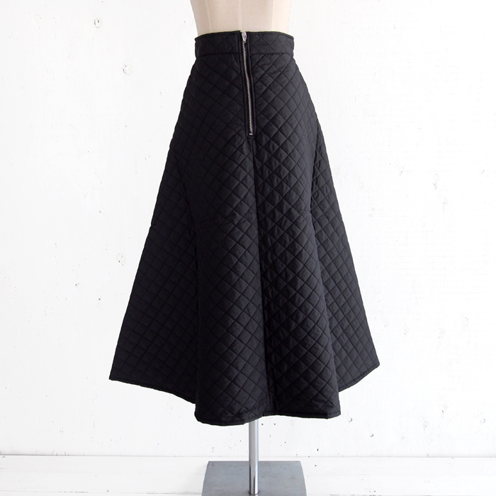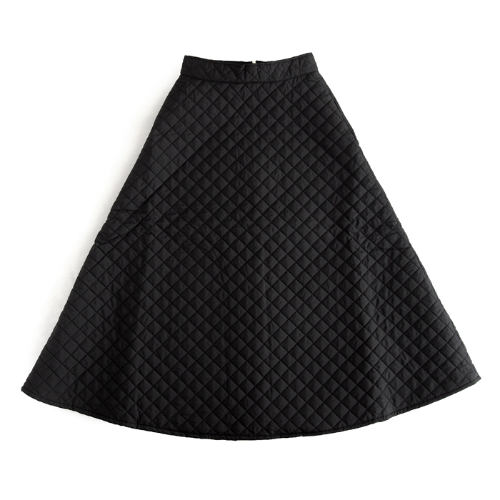 ハリのあるキルティング生地を使用したフレアシルエットのロングスカート。