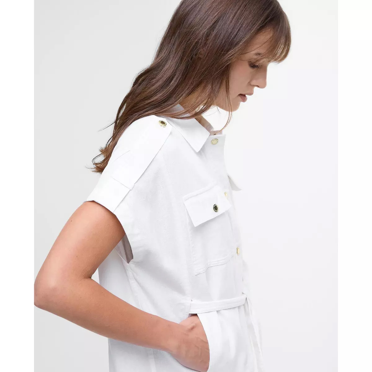 肩章やウエストを絞る一体型ベルトなど、クラシックなユーティリティディテールが特徴で、美しいシルエットを演出します。