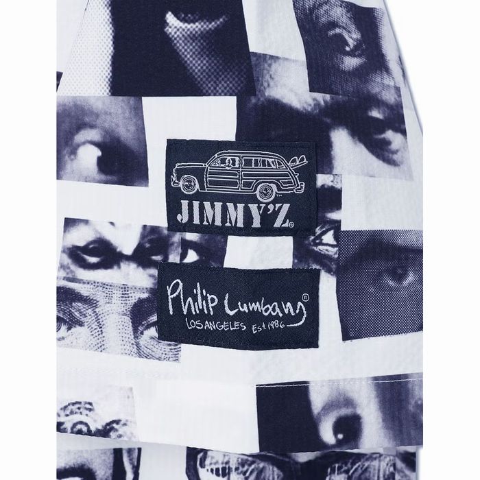 OLD JIMMY'Zの名作「EYEZ」柄をベースにLunch bagのEYEモチーフを重ねた特別なデザイン。JIMMY'Zの象徴的なフォトグラフィックに、Philip Lumbangのポップでユーモラスなアートを融合。スペシャルな一着に仕上げました。